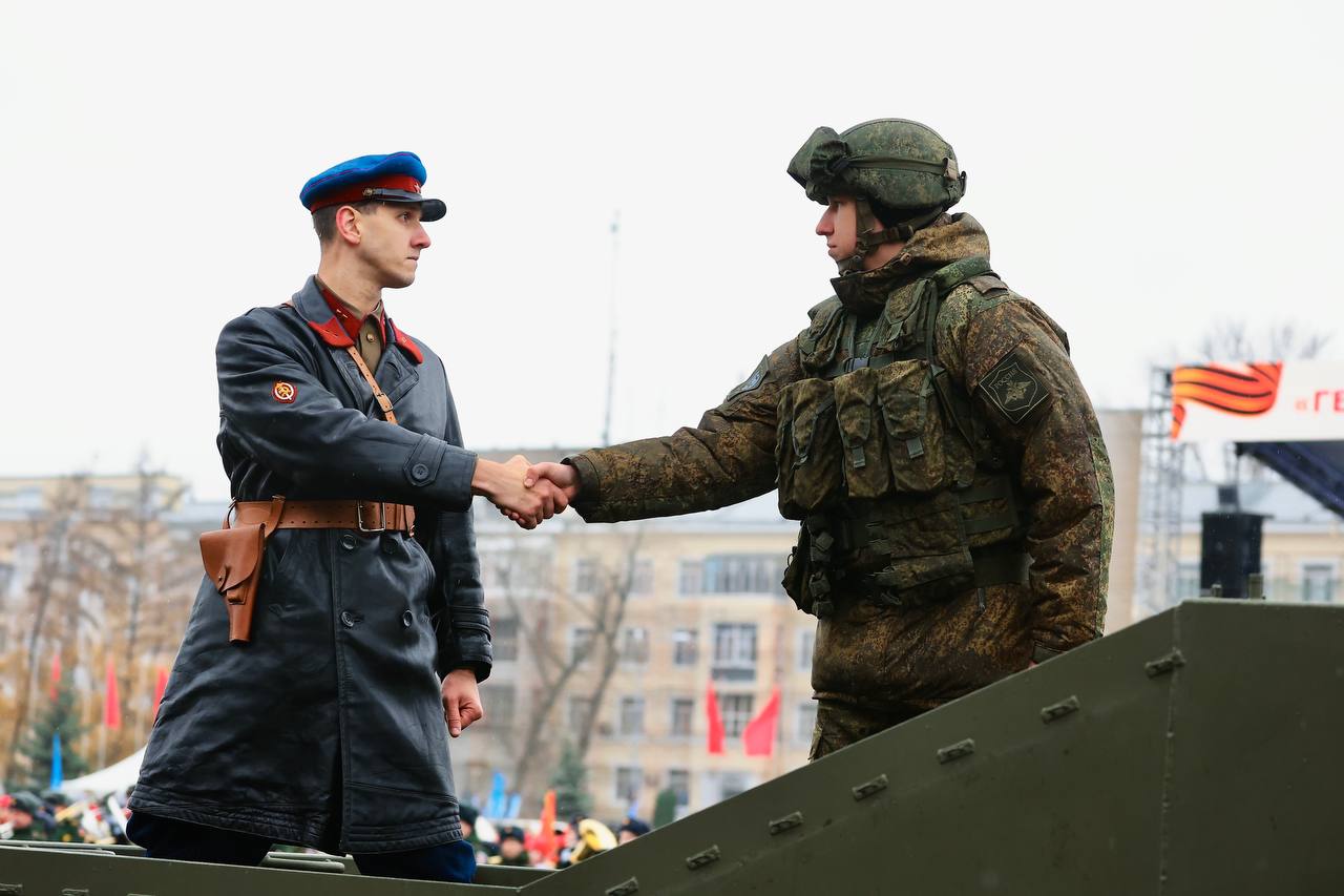 С приветственным словом к участникам обратился Герой Российской Федерации, начальник Главного штаба Всероссийского военно-патриотического общественного движения «ЮНАРМИЯ» Владислав Головин. Он отметил, что сегодня внуки и правнуки участников легендарного парада 1941 года сражаются на передовой с тем же врагом – нацизмом, только в новом обличье.