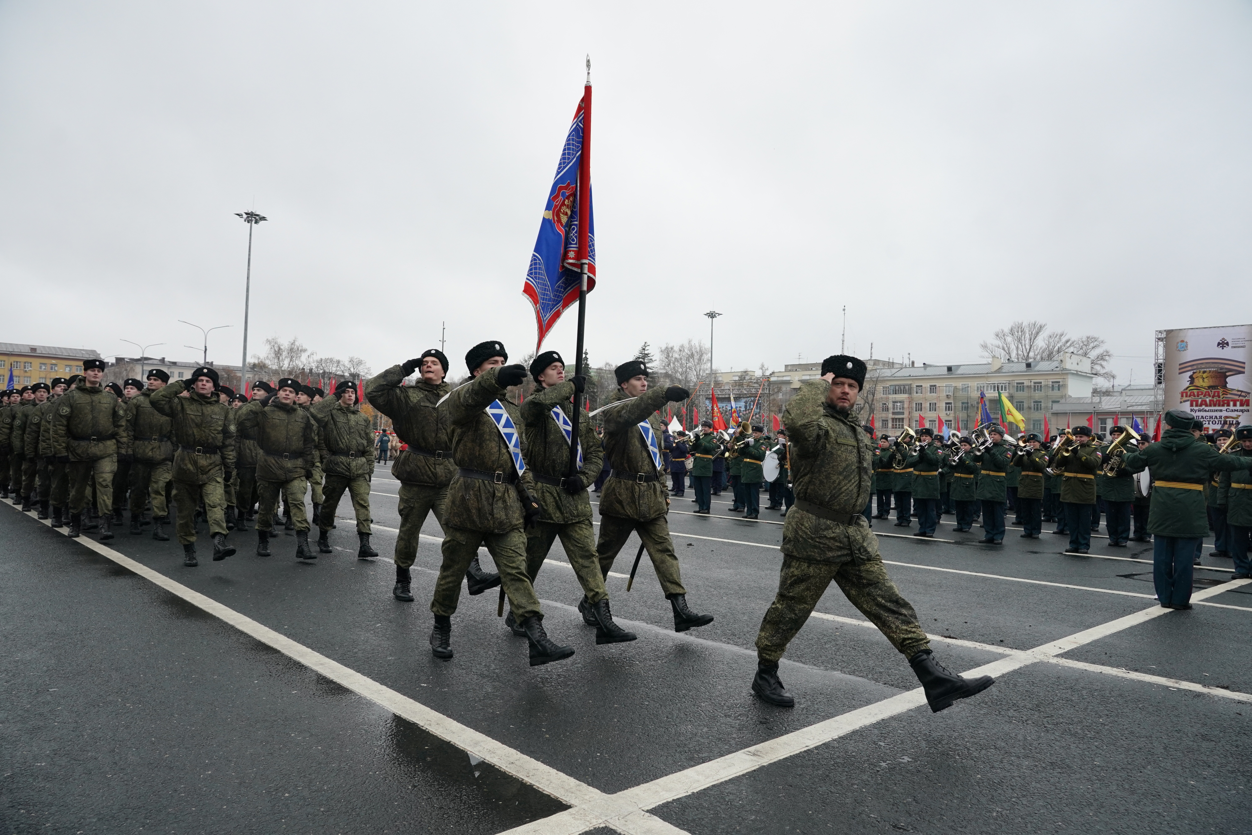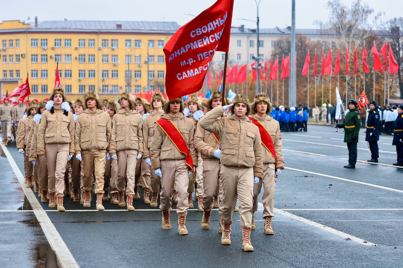 Торжественным маршем по главной площади города прошли 125 парадных расчетов, объединивших свыше 7,5 тысяч человек из 16 регионов России. В строю – подразделения силовых структур, представители военно-патриотических клубов, казачьих отрядов, ветеранских организаций, военных учебных центров, высших учебных заведений, кадетских классов, суворовских и нахимовских военно-морских училищ, юнармейских отрядов из регионов страны, а также самарских предприятий. Прохождение парадных расчетов и военной техники сопровождал Центральный военный оркестр Министерства обороны России.
